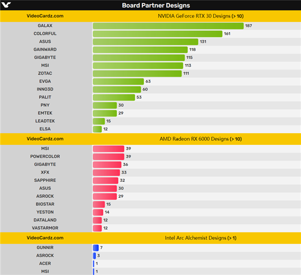 有人特意统计了各家品牌厂商的RTX 30、RX 6000非公版显卡数量,还拉上了Intel Arc A系列,对比相当惊人,肯定超出大多数人的想象: